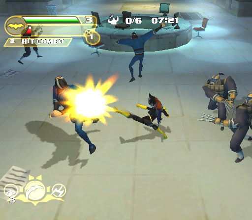 Ubisoft did away with all of the extra filler this go around and made a pure beat-em-up where you can choose to play as any of the above mentioned characters from the animated series. You can choose to go solo, or bring a friend along for the ride. While you can play as four characters, there’s only really two types: the heavier power types (Batman and Nightwing) and the faster but weaker characters (Batgirl and Robin.) Regardless of whatever character you pick, each hero plays the same: you can punch, kick, grab, block and use a variety of gadgets including batarangs, a grappling hook for a swinging kick attack and smoke pellets. Starting out you’ll have access to only a few basic combos, like three punches or kicks strung together, but points gathered by stringing together successful combo strings in levels provide reward points that you can use to buy new moves and gadget upgrades. The attacks feel great, much, much more so than in Vengeance, and the crazy combo strings that you can string together by games end help to elevate this over more repetitive beat-em-ups.