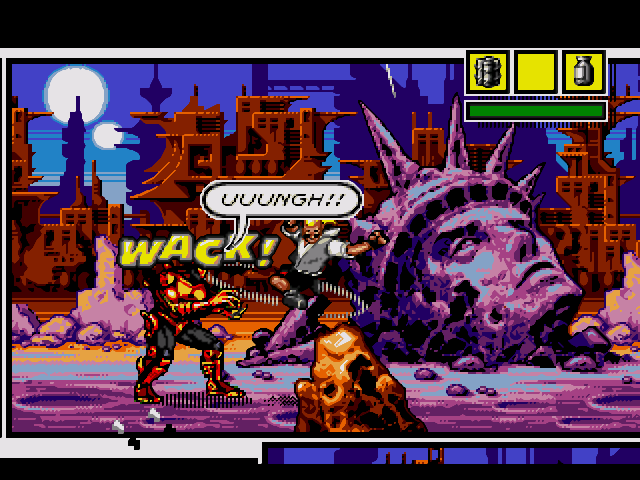 I’ve had a lot of good things to say about Comix Zone, but the game is not without its faults. What kept me from enjoying this game for a very long time is its difficulty. I’ve griped before about games that have a few lives and no continues, but starting out this game has no spare lives and no option to continue. From what I can comprehend I believe it throws you some bones at levels three and five by giving you one spare chance and then a second, but the game doesn’t really spell it out for that well. This can be the most frustrating in the few small sections where you have to make a jump over a small pit or are dangling above a bottomless hole, only to be knocked down by a flying enemy and sent back to the very start. One of the more bizarre additions and one I could never figure out is that you also take damage by punching things like barrels. It’s realistic, yes, but this is also a game about a guy in a comic book who punches mutants covered in slime and it makes a very difficulty game even harder. It’s not like in other games where you’re just hitting these objects just to get items, there are a lot of points where obstacles that are blocking your path absolutely need to be destroyed, forcing you to lose health in order to move forward.