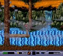 Ex-Mutants is a game that will requires you to memorize a lot of its levels in order to finish it, and that’s because of some poor design choices in areas. At around level three the stages start off with you riding on something: first a mine cart, then a raft and finally on top of a subway. These non-traditional levels help break up the pace of the traditional but still solid action plat-forming stages, but they also eat up your limited continues until you learn precisely where enemies will come from. With the mine cart stage it’s a simple matter of just learning when the obstacles will come up so you can dodge them accordingly, but for the other stages it’s because the colours of the enemies and the bullets blend into the colour of the backgrounds. During the raft stage, sea monsters will jump up and fire blue bullets that nearly match the colour of the water you’re on, making it hard to distinguish one from the other. The same goes for the subway, and for that matter the stage before the subway, that introduces tiny, hard to see bats that are not only hard to see, but also tough to kill because the range of your weapons is so limited.