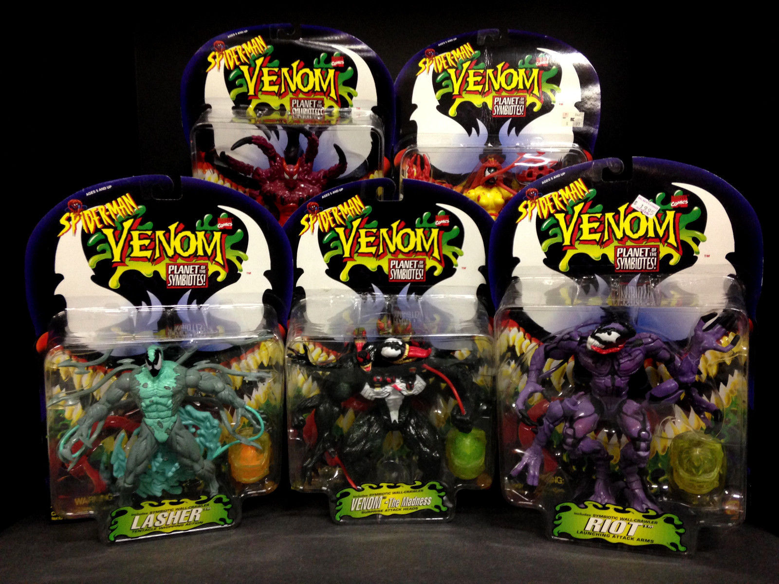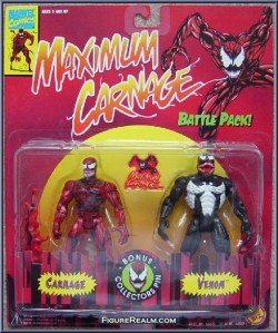 Maximum Carnage didn’t start out as a video game, but if you bring up the name with most people, they’ll talk about the game over the bloated comic book series in which it was based on. Original Marvel toy rights holder and now defunct company Toy Biz released a series of two and three packs of action figures starring the main trio of the game: Spider-Man, Venom and of course, Carnage. The package is branded as Maximum Carnage with the title character looking a little like he does on the package of the video game, however these were not new figures, rather just the same figures used in the first wave of the series based on Spider-Man: The Animated Series from the 90’s: