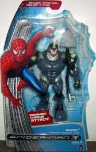 For both Sam Raimi’s Spider-Man and its sequel, there wasn’t really many characters to turn into action figures other than Spider-Man and the movies sole villain; The first line of Spider-Man movie figures featured J.Jonah Jameson with desk pounding action and Norman Osborn complete with easy chair. For Spider-Man 3, there were more than enough characters packed into that movie for action figure fodder, yet Toy Biz also expanded the line with villains not seen in the film based on their appearances from the Spider-Man 2 and Spider-Man 3 video games including Mysterio and the Rhino: