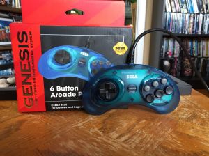 The name of this controller pretty much explains what it is: a flawless recreation of the 6 button controller that was introduced fairly late into the Sega Genesis’ life cycle for the purposes of having parity with the Super Nintendo’s controller for games like Street Fighter II and Mortal Kombat II. There are four different types of the controller: two with the classic Genesis plug in black and clear blue and two for use with PC’s via USB in the same color scheme. With regards to looks, Retro-Bit’s offering could easily be confused with the original controller line if it didn’t come in modern packaging with the companies logo:
