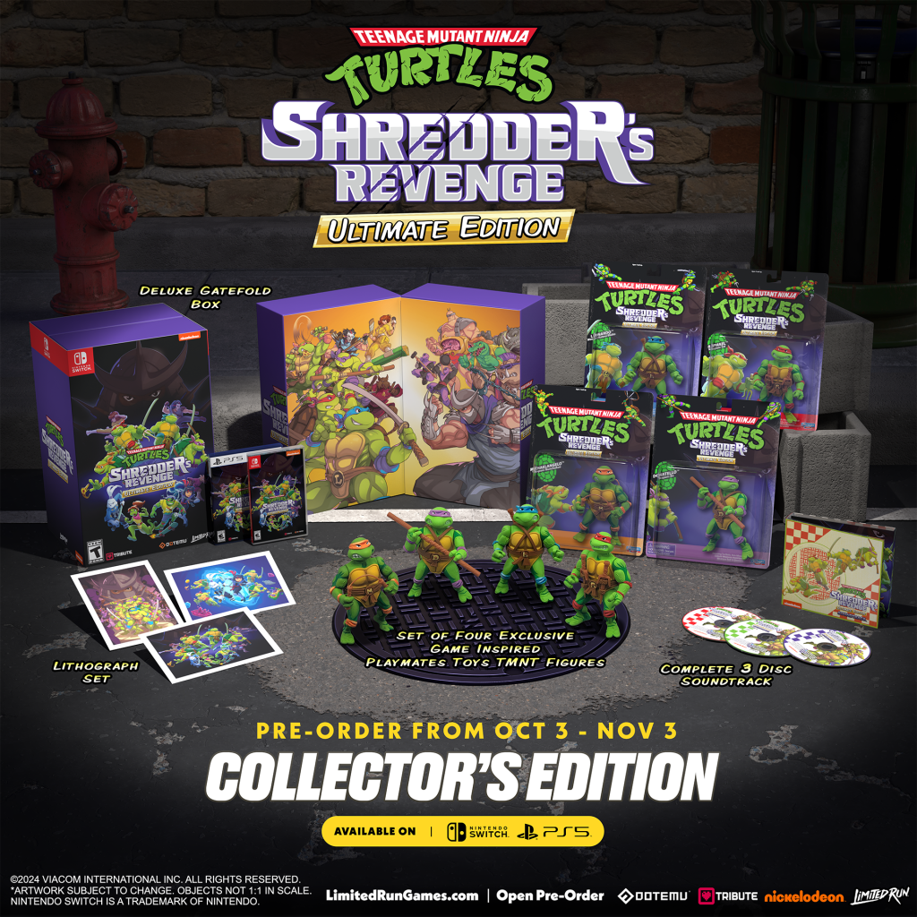 Limited Run Games produced physical editions for Shredder’s Revenge when it launched in 2022 and went on to manufacture an updated release with the Dimension Shellshock content on both disc and cart. Now a third edition, the “Ultimate Edition”, is up for pre-order on Limited Run Games’ website. The standard release, available only for PlayStation 5 and Nintendo Switch, comes with everything on your medium of choice while a pricier collectors edition has the game, 4 Playmates action figures, a 3 CD soundtrack, a lithograph set and comes packaged in a gatefold box.